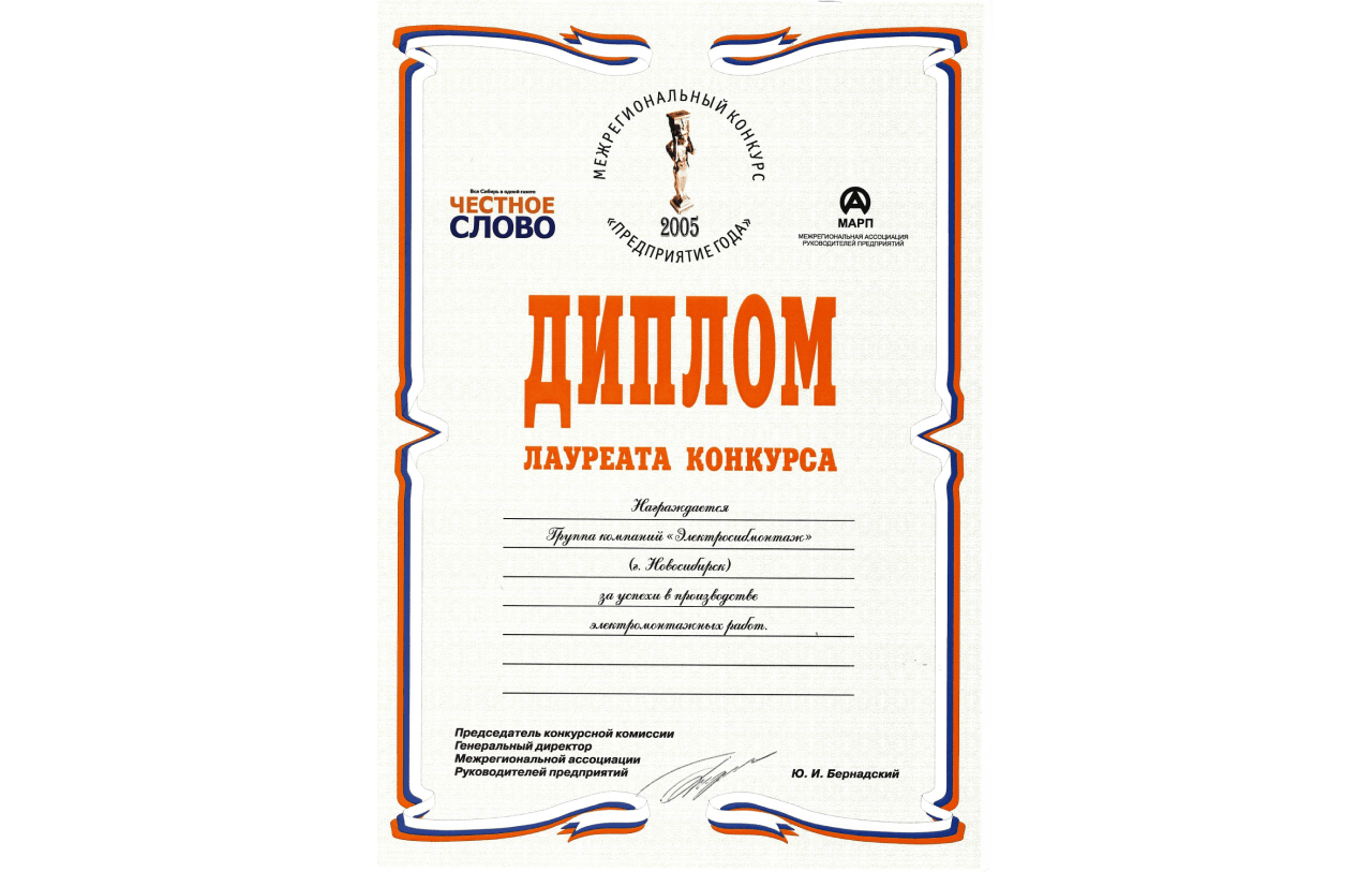 ГК «Электросибмонтаж» становится лауреатом межрегионального конкурса «Предприятие года» и получает диплом за успех в производстве электромонтажных работ.