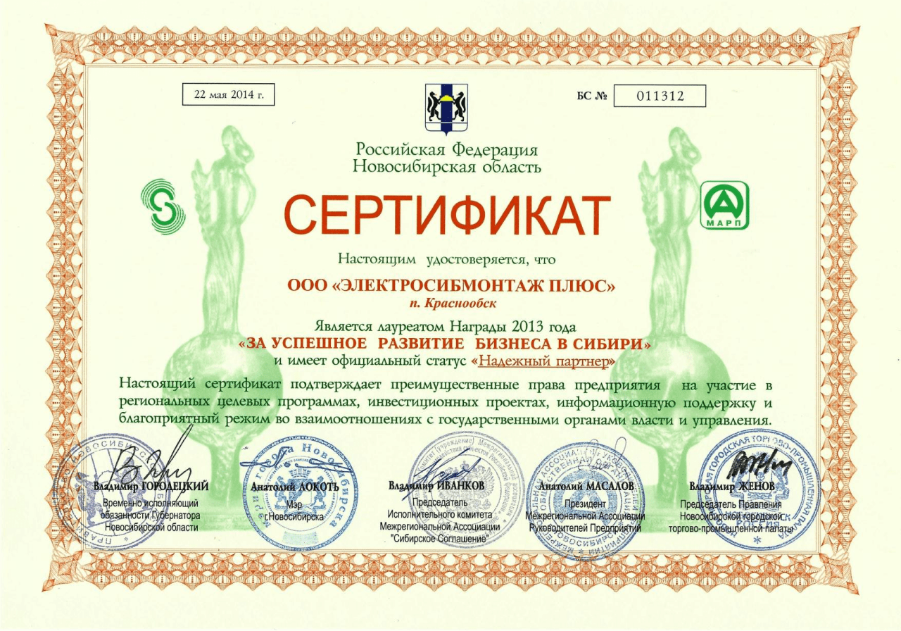 Компания «ЭЛЕКТРОСИБМОНТАЖ ПЛЮС» вновь оказывается лауреатом награды 2013 года «За успешное развитие Бизнеса в Сибири» и получает официальный статус «Надежный партнер».